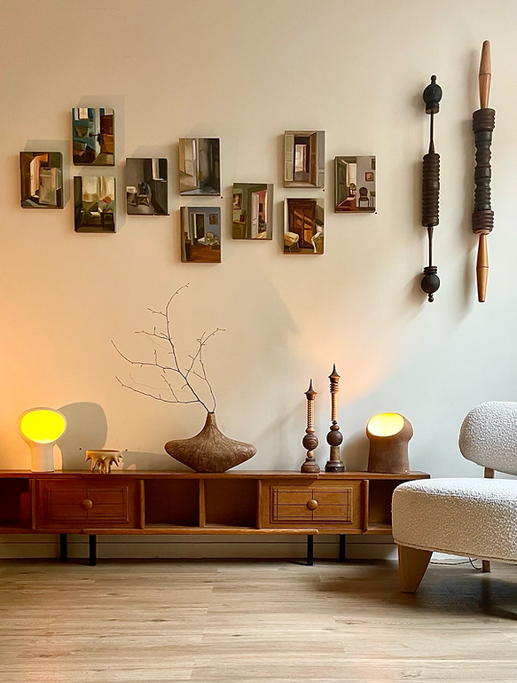 Il s’agit de scènes d’intérieurs, des espaces intimes baignés de lumière. Des lieux-refuges, emplis de calme, de clarté, de possibilités. Ses peintures sont réalisées à l’huile, sur toile ou sur petits panneaux de bois au format 18x24 cm.